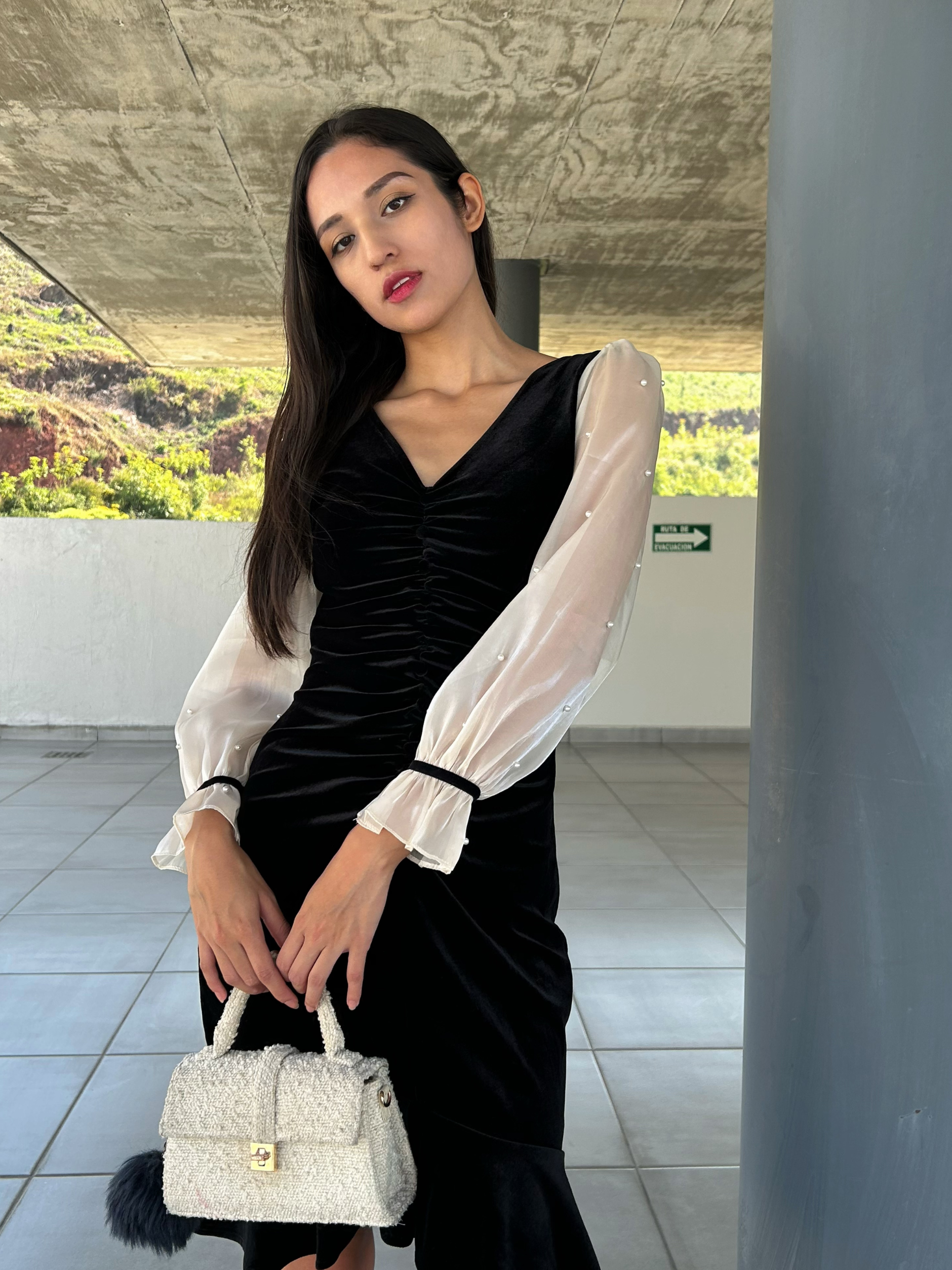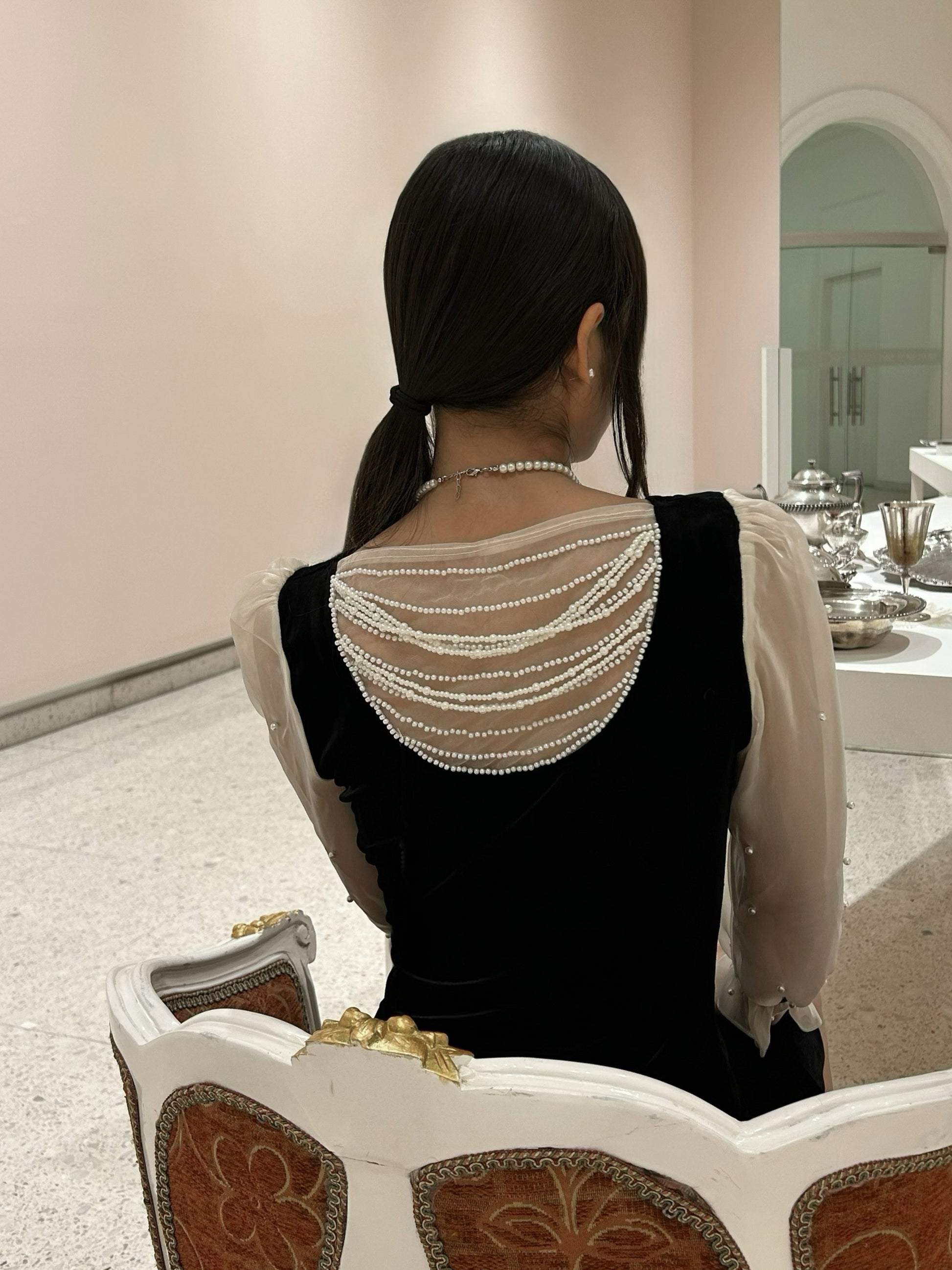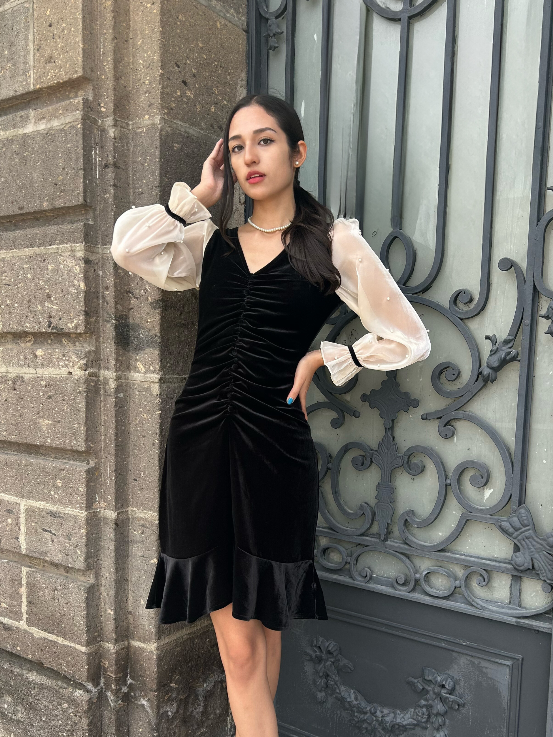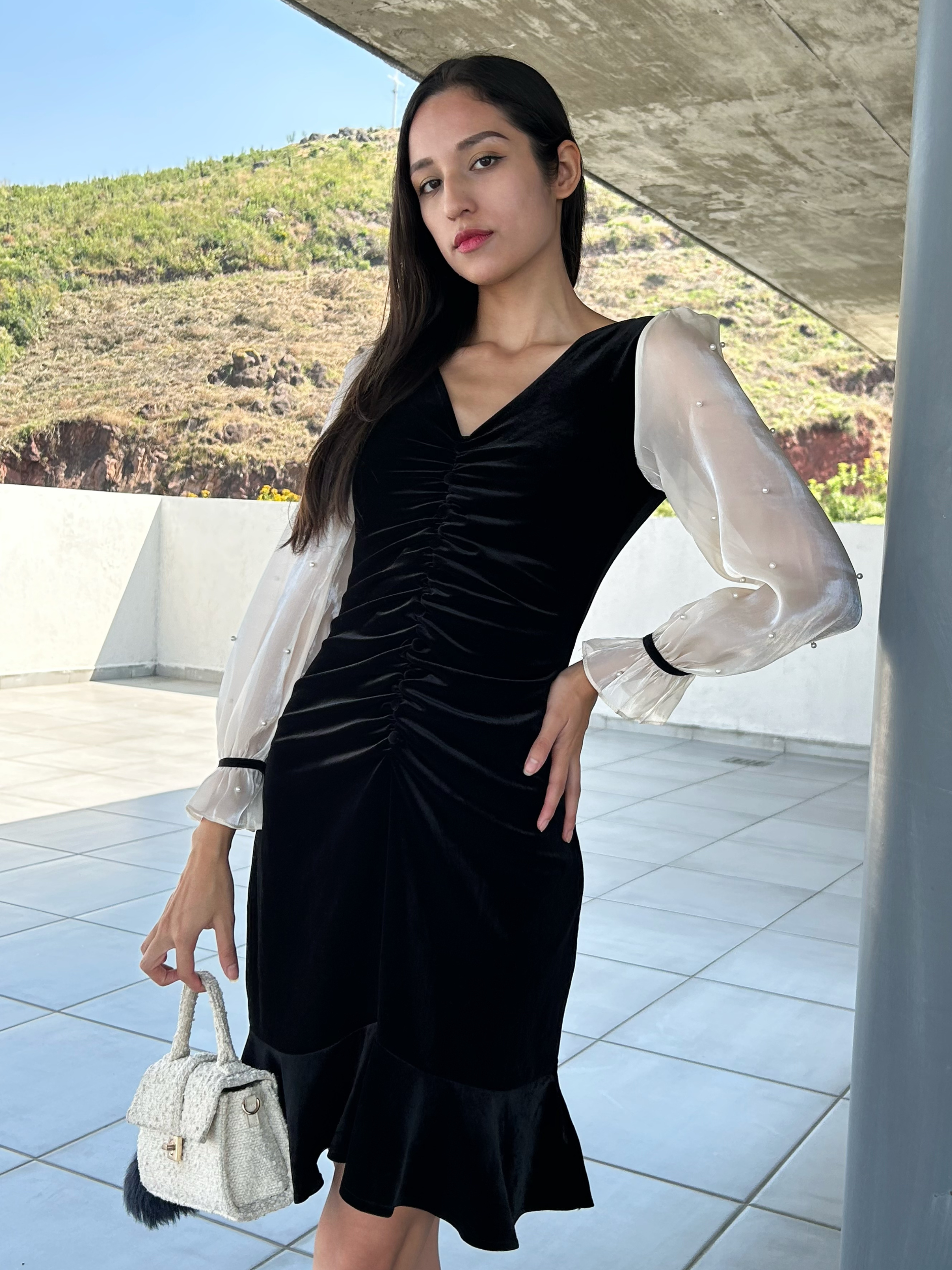 Vestido midi terciopelo con perlas en espalda Mia